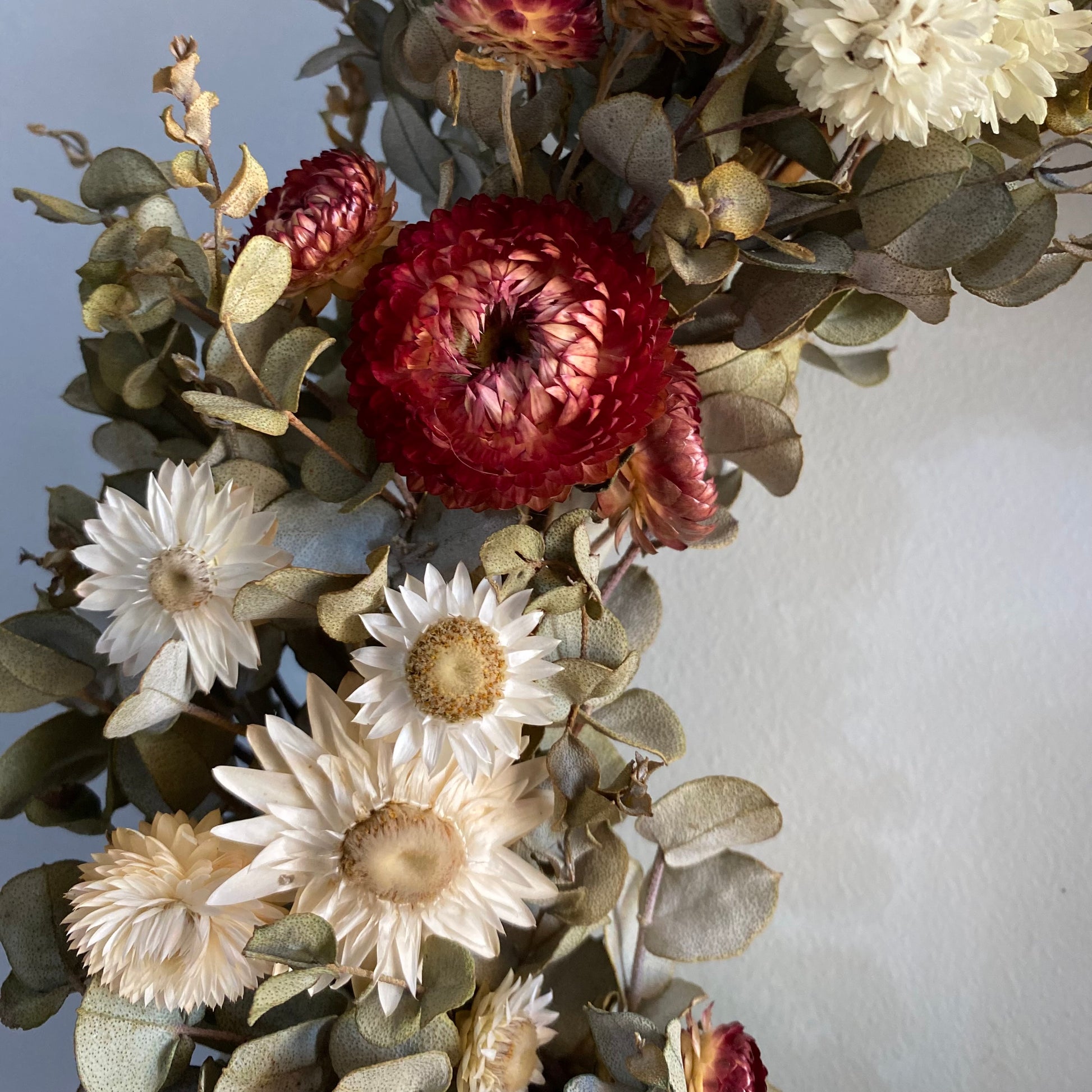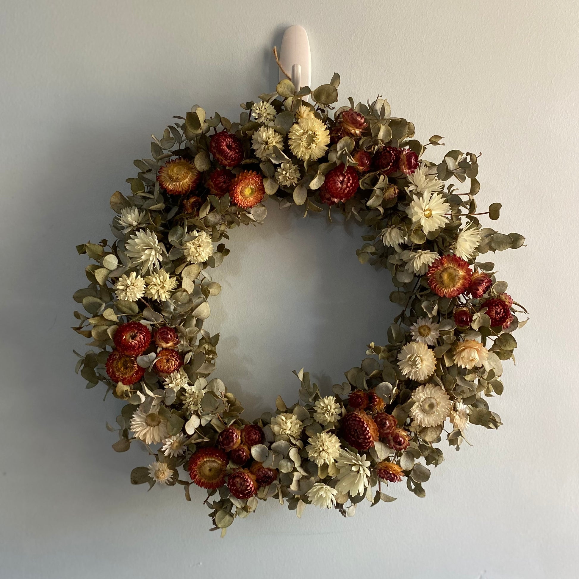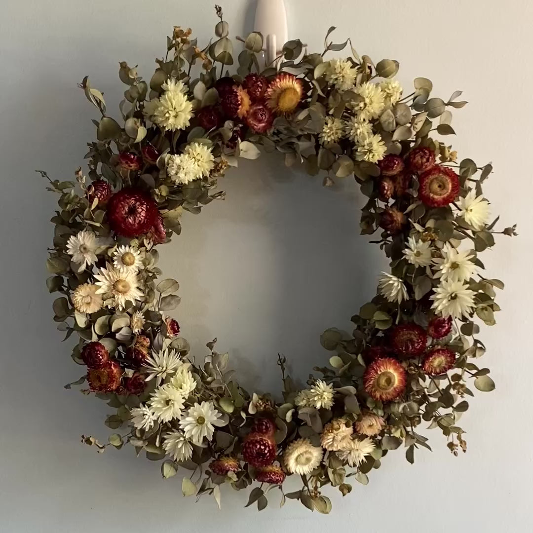 This festive Everlasting Daisy Wreath is blooming with a variety of Red and White Australian Daises on a background of silvery green Eucalyptus foliage. It reminds me of candy canes and will bring the fresh smell of eucalyptus into your home this Christmas. This wreath is made from naturally dried foliage and flowers, locally grown in my home garden in Perth, Western Australia. These wreaths are made from wreath bases I made myself from vines and shrubs in my garden. I have then used jute string to secure my foliage and flowers to the wreath base.
