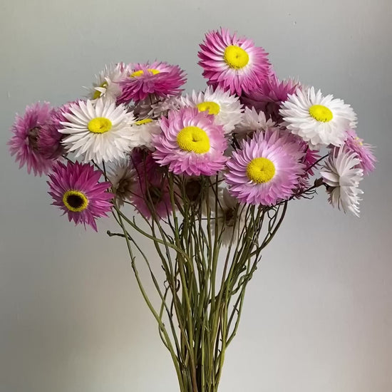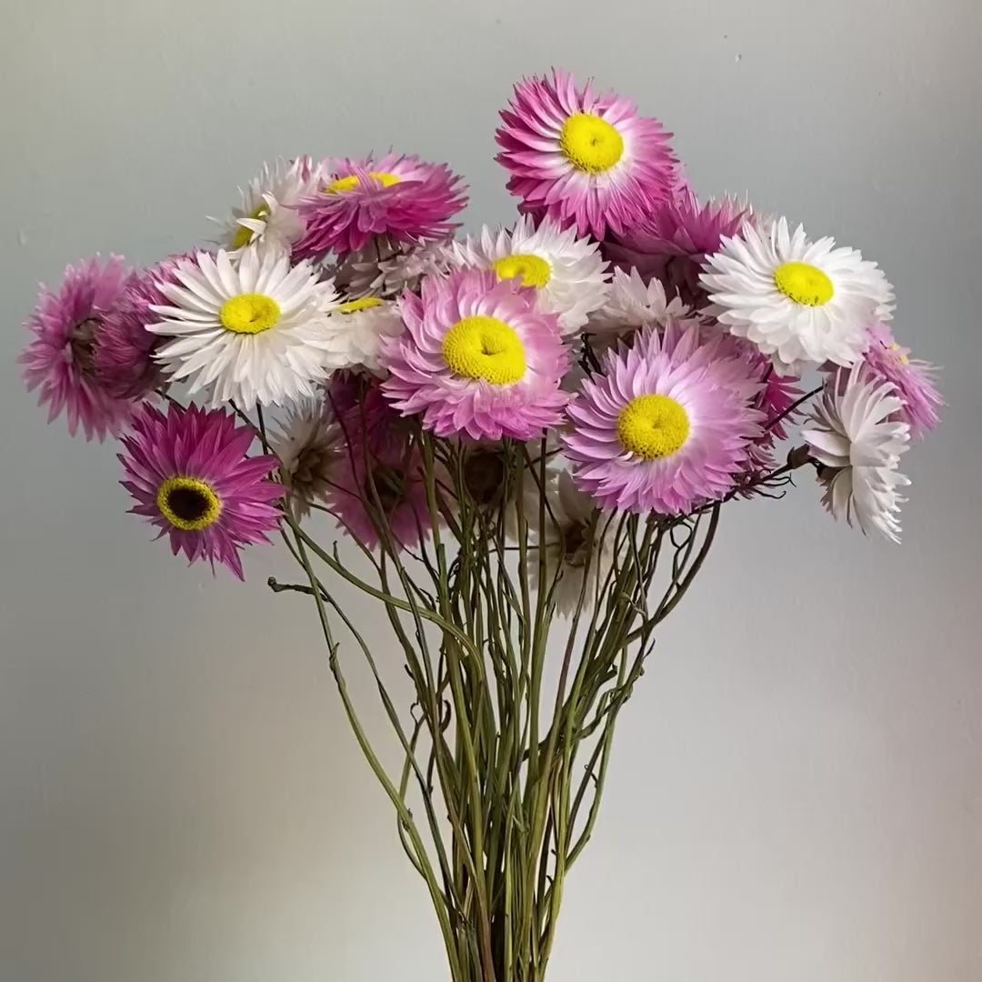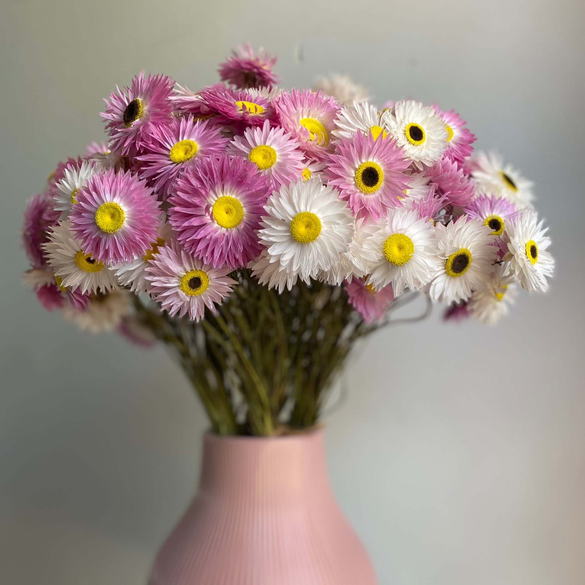 This gorgeous bouquet is made of Pink and White Everlasting Daisies. This iconic and well-loved Australian Wildflower has been grown locally in my home garden in Perth, Western Australia. These flowers have been naturally dried and will make a joyful gift. Alternatively, they will bring a lighthearted and playful feeling to your home or floral crafts. Each bouquet has approximately 40 stems and has been carefully wrapped in brown paper and tied with jute string.